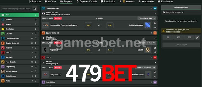 O 479Bet oferece uma grande seleção de opções de apostas em e-sports com probabilidades competitivas